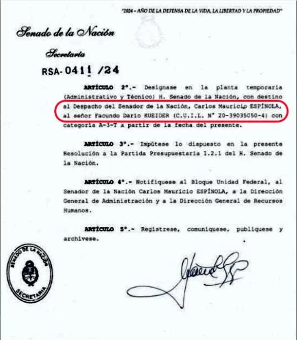 Kueider hizo nombrar a su hijo Facundo Darío Kueider con categoría A3 (más de un millón de pesos de sueldo) en el bloque Unión Federal que él mismo integra, pero al servicio del senador Carlos Espínola. El nombramiento fue concretado este mismo 2024, lo que delata el pacto con el oficialismo nacional para acompañarlos en los proyectos de ley a cambio de favores lo que le valió ser tildado como el principal enemigo del PJ en la provincia.