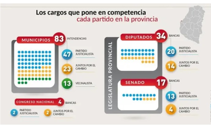 En Entre Ríos se elegirán candidatos a gobernador y vicegobernador, 17 senadores provinciales, 34 diputados provinciales, 83 intendentes, 84 jefes de comunas y cuatro diputados nacionales.