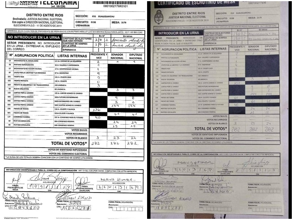 Mesa 2179, Esc. Prov. N°16 Colegio de Urdinarrain. El telegrama en blanco y negro es el escaneo recuperado de la página oficial de resultados, el amarillo es el que quedó para los fiscales. Puede verse que en el primero el Frente de Todos muestra 136 votos para Presidente, contra 0 de Juntos por el Cambio, igualmente hay 282 votos totales. En el segundo TODOS tiene 61 votos (al igual que para senadores y diputados) y JUNTOS tiene 157 (más que la suma de todas sus internas, ahora sí, la cuenta final da 282 votantes.