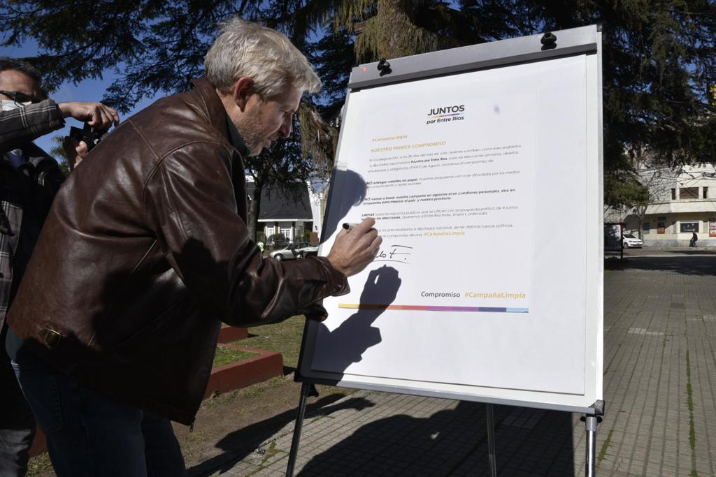 Los precandidatos de la Lista Juntos que competirá en las internas de Juntos por Entre Ríos, Rogelio Frigerio, Marcela Ántola, Atilio Benedetti y Mauricio Davico, firmaron el compromiso “Campaña Limpia” con ejes fundamentales para la convivencia durante las elecciones que se realizarán en septiembre y noviembre de este año. La presentación del primer eje de campaña se realizó al aire libre en la Plaza Urquiza de Gualeguaychú.
