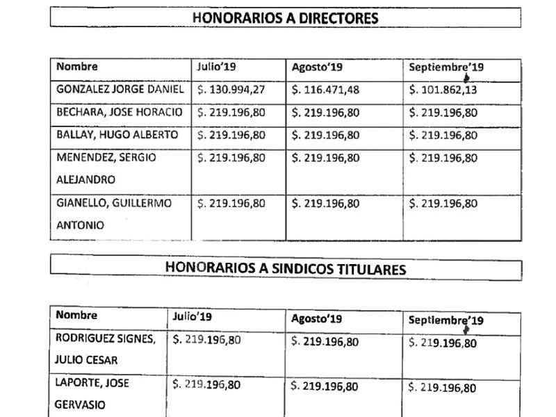 Con respecto a los directores y síndicos titulares, percibieron anticipos de honorarios de bolsillo por $ 219.196,80. Los suplentes no cobran honorarios, salvo que por alguna razón deban asumir como titulares.