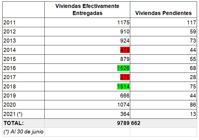 -De acuerdo al informe del IAPV, desde 2011 a mediados de 2021 (más de diez años) el promedio anual de viviendas recibidas por familias entrerrianas no llega a 1.000 (exactamente, 979).