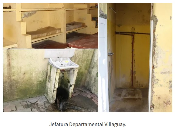 En la Jefatura de Gualeguaychú, de acuerdo al testimonio de las personas privadas de su libertad “hay ratas que salen de la cloaca y de otros sumideros, por lo que deben cerrar o bloquear con botellas u otros objetos para que no circulen roedores”. También contaron que sufren mucho el frío por las ventanas rotas y la humedad, y que no poseen utensilios y deben comer con las manos. “Llama la atención del equipo la cantidad de personas detenidas en la Jefatura Departamental de Gualeguaychú y, en consonancia, los extensos períodos de detención de algunas personas. El estado edilicio es muy contrastante entre la zona de la fachada y el ingreso público (…) con los lugares de detención que, según reconocen las propias autoridades, se encuentran en peligro de derrumbe”, dice el informe.