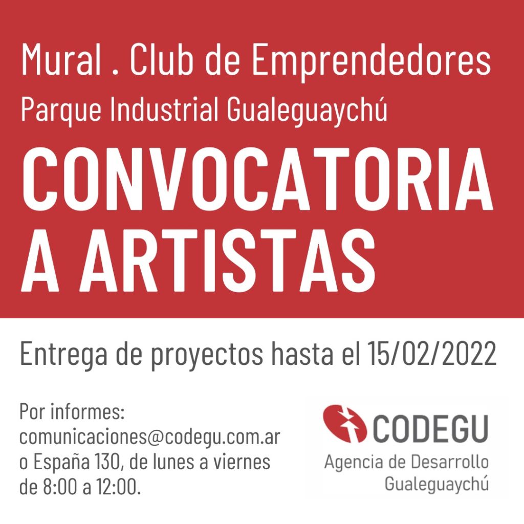 La Codegu – Agencia de Desarrollo Gualeguaychú invita a artistas plásticos en la disciplina de pintura mural, dibujo, moldeado de formas o afines, a participar de la convocatoria para presentar ideas-diseño para ornamentar el “Club de Emprendedores” en su parte exterior, sito en el Parque Industrial Gualeguaychú.