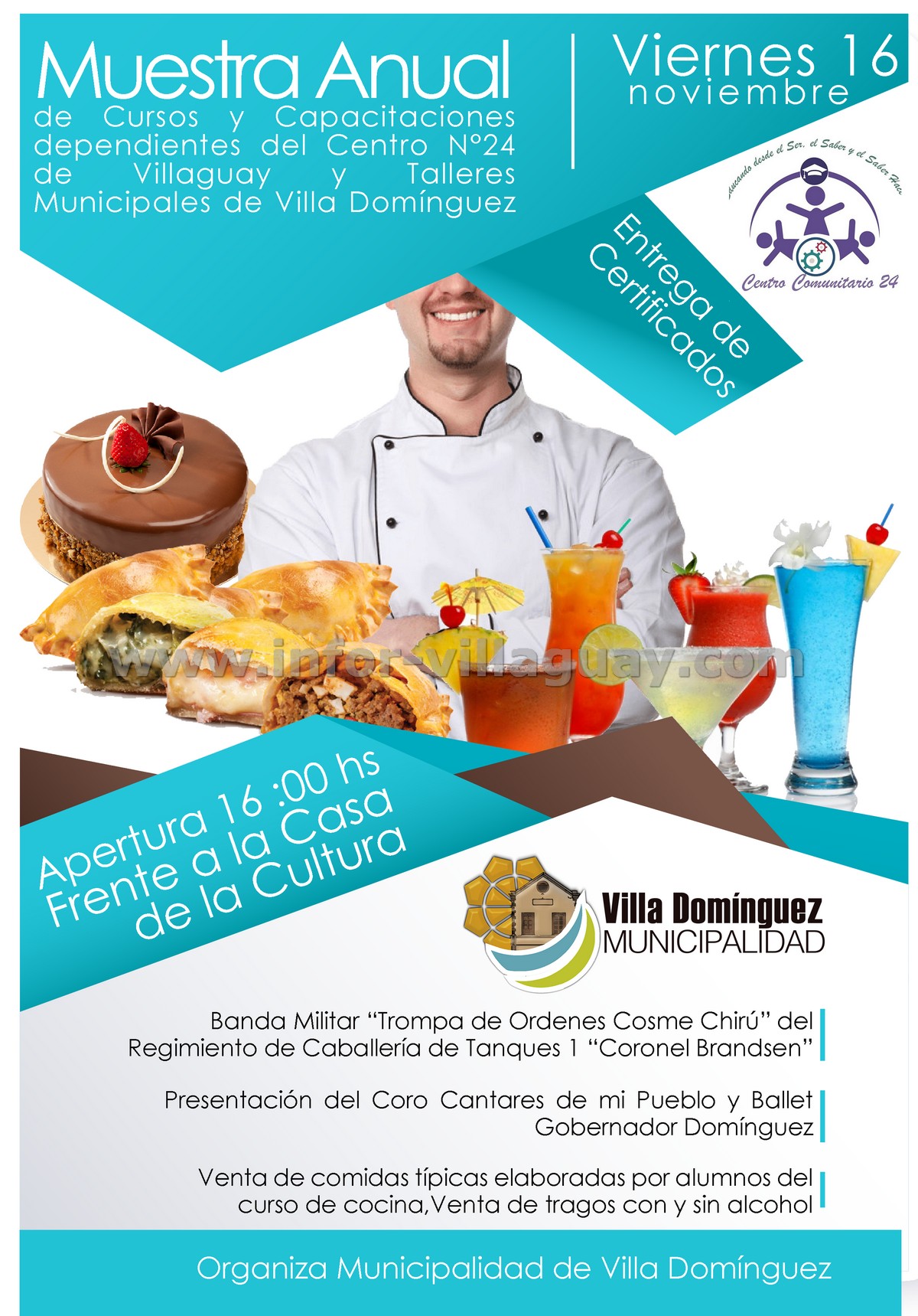 La Municipalidad de Villa Domínguez invita a la comunidad a presenciar la Muestra Anual de Cursos y Capacitaciones dictadas en la Casa de la Cultura dependientes del Centro Educativo Comunitario N°24 de la ciudad de Villaguay, este viernes 16 de noviembre a las 16 hs, frente a la casa de la Cultura Se presentara la Banda Militar “Trompa de Ordenes Cosme Chirú” del Regimiento de Caballería de Tanques 1 “Coronel Brandsen”, “Ballet Gobernador Domínguez” y el Coro Municipal “Cantares de mi Pueblo” , además estarán a la venta comidas dulces y saladas, repostería y tragos con y sin alcohol , todo elaborado por alumnos .La ceremonia de apertura dará inicio a la hora 16 frente a la Casa de la Cultura con la presencia de autoridades de gobierno , talleristas y alumnos , los cuales recibirán su certificado de estudio.