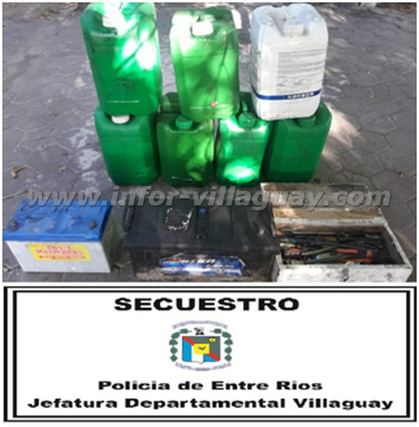 Relacionado a denuncia radicada en la Comisaría Villa Domínguez por un hombre de 30 años de edad a quien personas desconocidas le habían sustraído 100 litros de gas oil, una batería de 160 amperes, una batería de 110 amperes y una caja de herramientas, los cuales había dejado en el interior de una máquina fumigadora situada en un campo ubicado en colonia El Carmel, Ingeniero Sajaroff, es que personal policial de la mencionada dependencia policial tras arduas tareas investigativas recuperó y secuestró la totalidad de lo denunciado como sustraído. En la causa que se investiga fueron identificados cuatro personas mayores de edad los cuales quedaron informados a la fiscalía local supeditados a la causa. Por orden judicial, los elementos fueron entregados a su propietario.-
