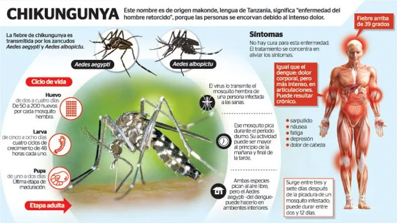 Entre los síntomas habituales están la fiebre mayor a 39°, dolores en las articulaciones, dolor de cabeza, náuseas y hasta manchas rojas en la piel.