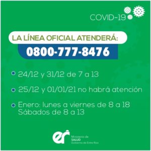 La línea que dispuso la provincia desde el Ministerio de Salud de Entre Ríos, para orientar a la comunidad sobre #Covid19, informó que los días 24 y 31 de diciembre atenderá de 7 a 13 horas; mientras que el 25 de diciembre y el 1 de enero no habrá atención.